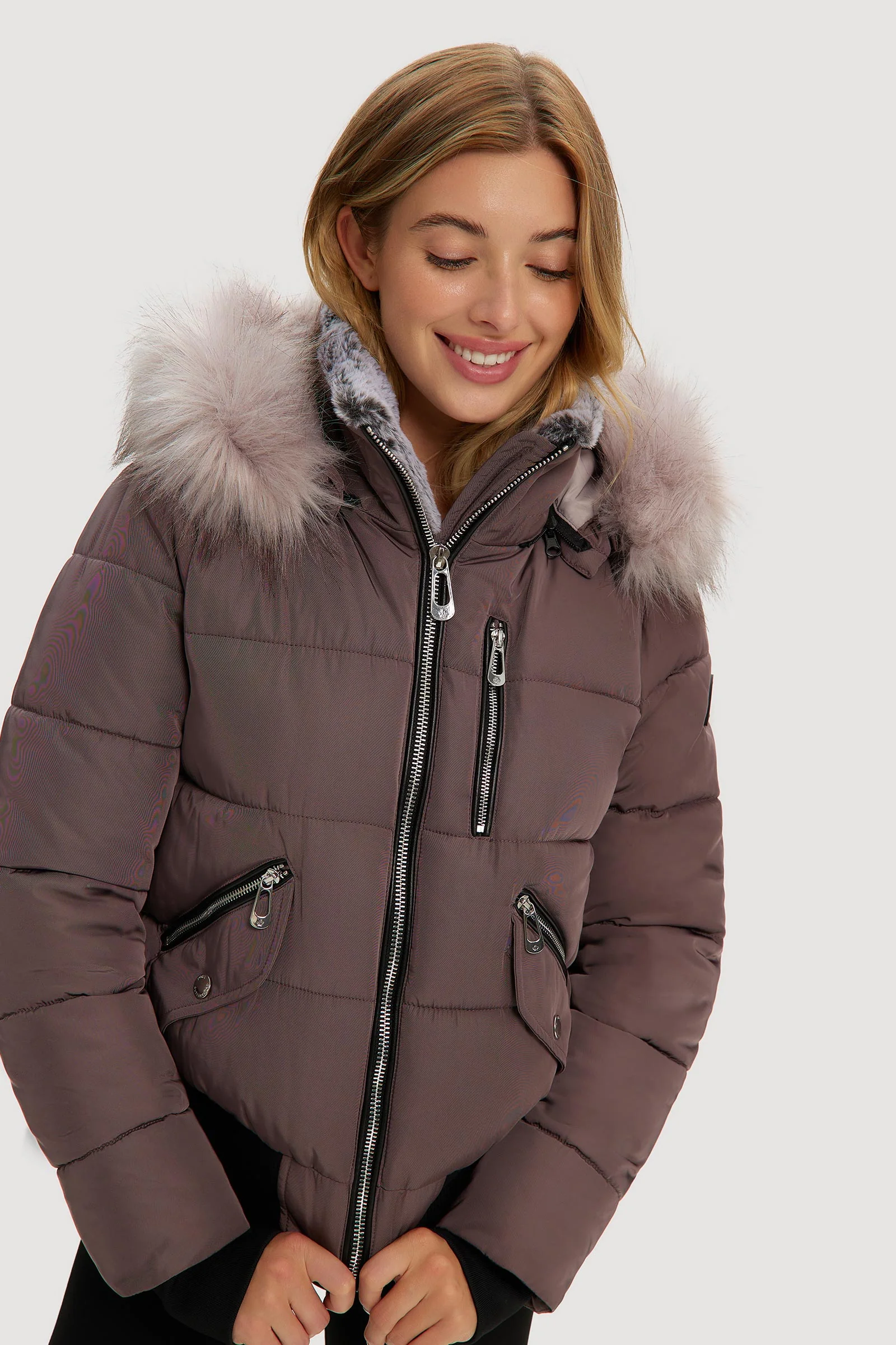 The Vic puffer is a versatile piece that transitions well between seasons. Its shorter cut is complemented by contrasting trims and ribbed cuffs and hem. The high collar features faux plush lining, and the generous hood is trimmed with warm vegan fur.